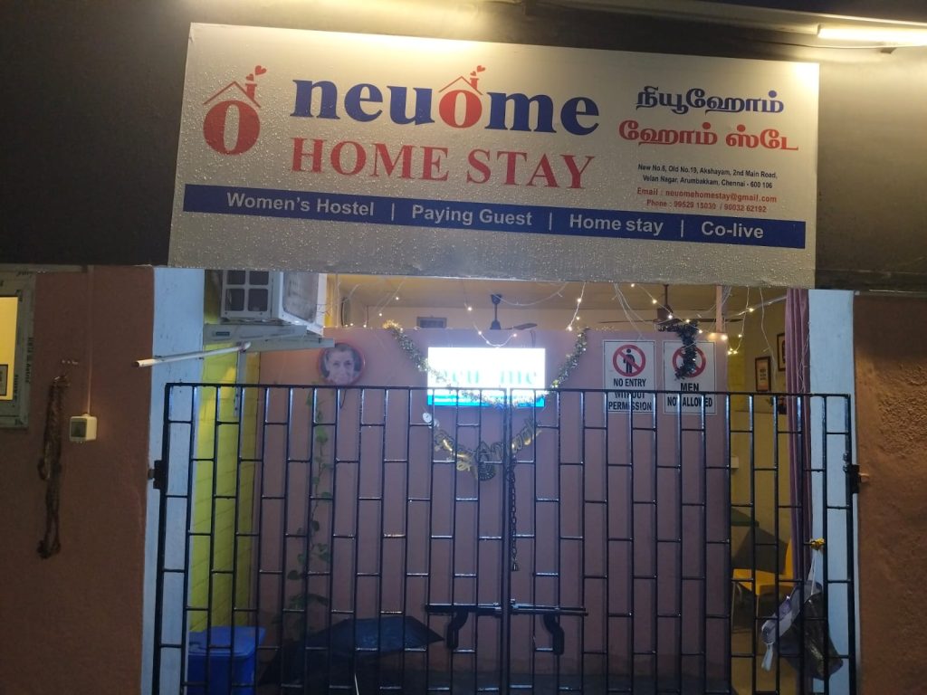 Hostels | PGs (Paying Guest) | Co-Live | Homestay | Serviced Apartments Amenities And Facilities AC & Non AC Rooms Television WI-FI Washing Machine Food Veg And Non-Veg CCTV Camera Juicer Microwave Oven Induction Stove Neuome Women’s Hostel Gallery – Experience Comfortable Living in Arumbakkam Our Videos Our Packages Neuome Month Long Neuome Year Long Neuome Day Long Timings Chart Tea or Coffee: (All Days)Morning: 7 AM to 8 AMEvening: 5 PM to 6 PMBreakfast :Monday to Friday: 8 AM to 10 AMWeekends: 8 AM to 11 AMLunch:Packed Lunch: Monday to Saturday : 8.00 AM*No Packed Lunch on SundayIn-house Dining :Monday to Friday: 1PM to 2 PMWeekends: 1PM to 3 PMDinner:All Days: 8 PM to 10 PM Terms of Service Deposit : One Month Notice Period - 1 Month Gate Closing Time – 10.00 PM Visitor Entry – Restricted (9 to 5 PM with Prior Permission) Non-Veg Food Allowed only in the dining area. Opposite Gender – Not allowed inside the premises Smoking / Drinking – Not allowed inside the premises Partying / Loud music – Not allowed beyond 09.00 PM Request a Quote Get the best living experience at Neuome Home Stay Please enable JavaScript in your browser to complete this form.Name *Email *Single Line TextComment or Message *SEND MESSAGE Scan And Review Us!